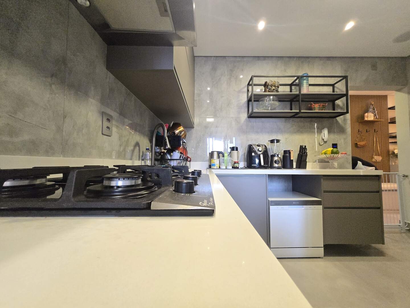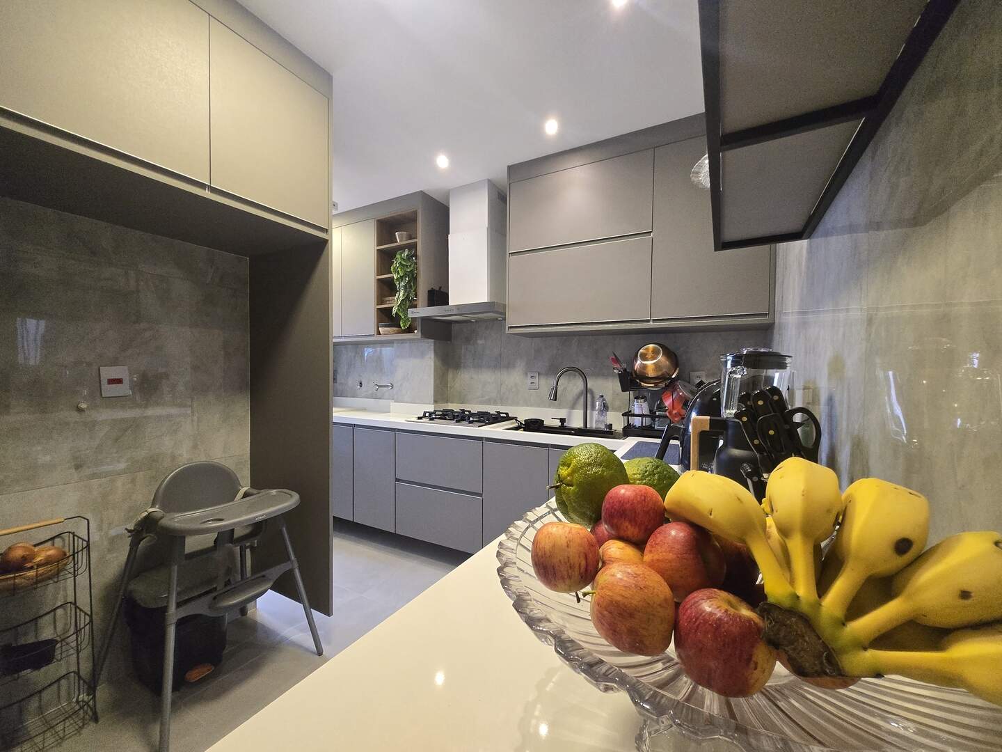 Bancadas em quartzo branco na Cozinha, Banheiros e lavanderia;