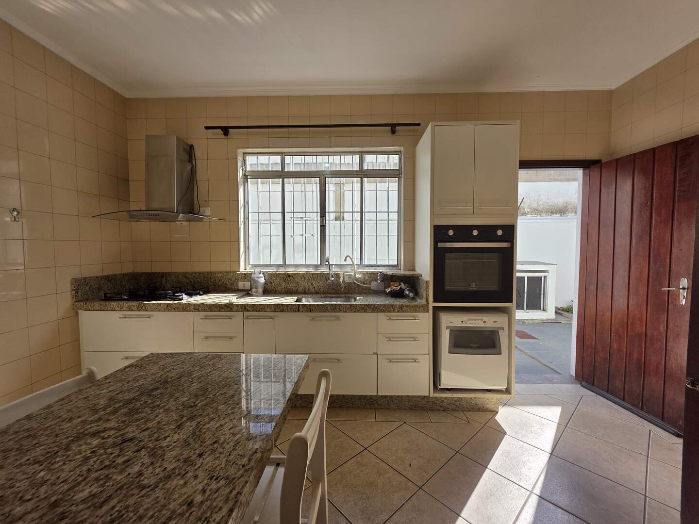 Cozinha planejada equipada com fogão, cooktop, coifa e forno